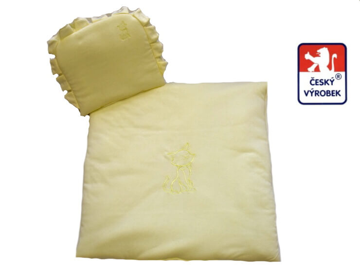 Peřinky na kočárek Dětský svět mako, žluté s kočičkou, jsou vyrobeny z velmi příjemného 100% atestovaného, bavlněného materiálu mako, s výšivkou. Peřinky na kočárek slouží jako vysoce teploučká deka s polštářkem na zakrytí miminka. Peřinky na kočárek jsou vyrobeny z velice příjemného, jemného, 100% Bavlněného atestovaného maka. V dečce a v polštářku je všité hřejivé, antialergické, atestované duté vlákno a na dečce i polštářku je vyšita decentní výšivka.