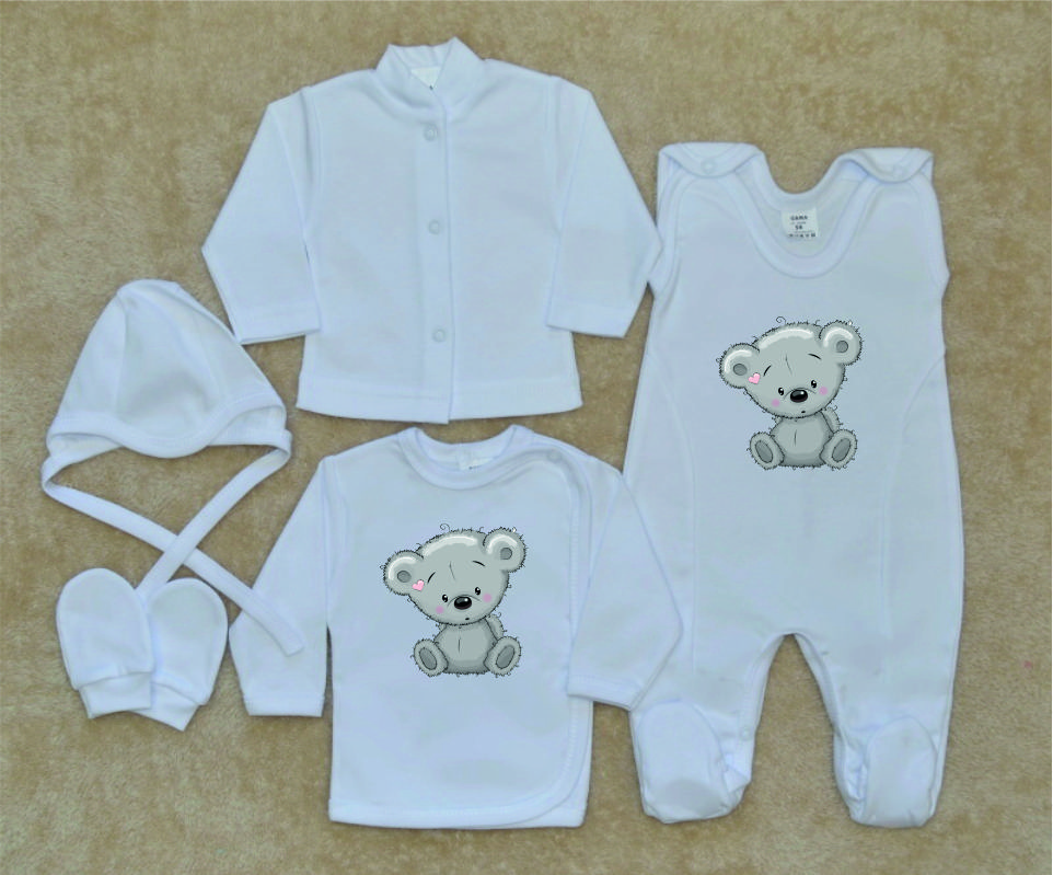 Bílá kojenecká soupravička pro miminko do porodnice, Gama, šedý medvídek je nádherná, vysoce kvalitní, svým potiskem decentní, 5-dílná kojenecká soupravička pro miminko, která je vyrobená ze 100% velmi jemné, kojenecké, velmi příjemné, atestované bavlny, vhodné pro miminka.