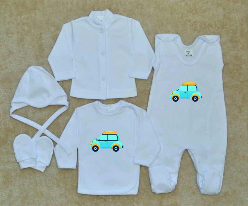 Kojenecká soupravička pro miminko do porodnice, Gama, auto, je krásná, vysoce kvalitní, svým potiskem decentní, 5-dílná kojenecká soupravička pro miminko, která je vyrobená ze 100% velmi jemné, kojenecké, velmi příjemné, atestované bavlny, vhodné pro miminka.