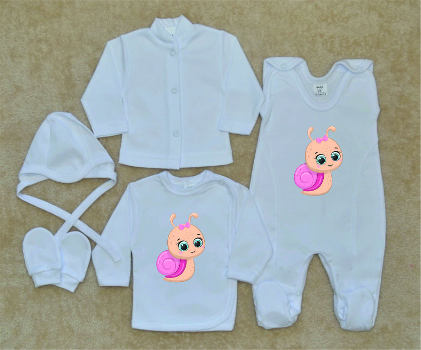 Kojenecká soupravička pro miminko do porodnice, Gama, šneček, je krásná, vysoce kvalitní, svým potiskem decentní, 5-dílná kojenecká soupravička pro miminko, která je vyrobená ze 100% velmi jemné, kojenecké, velmi příjemné, atestované bavlny, vhodné pro miminka.