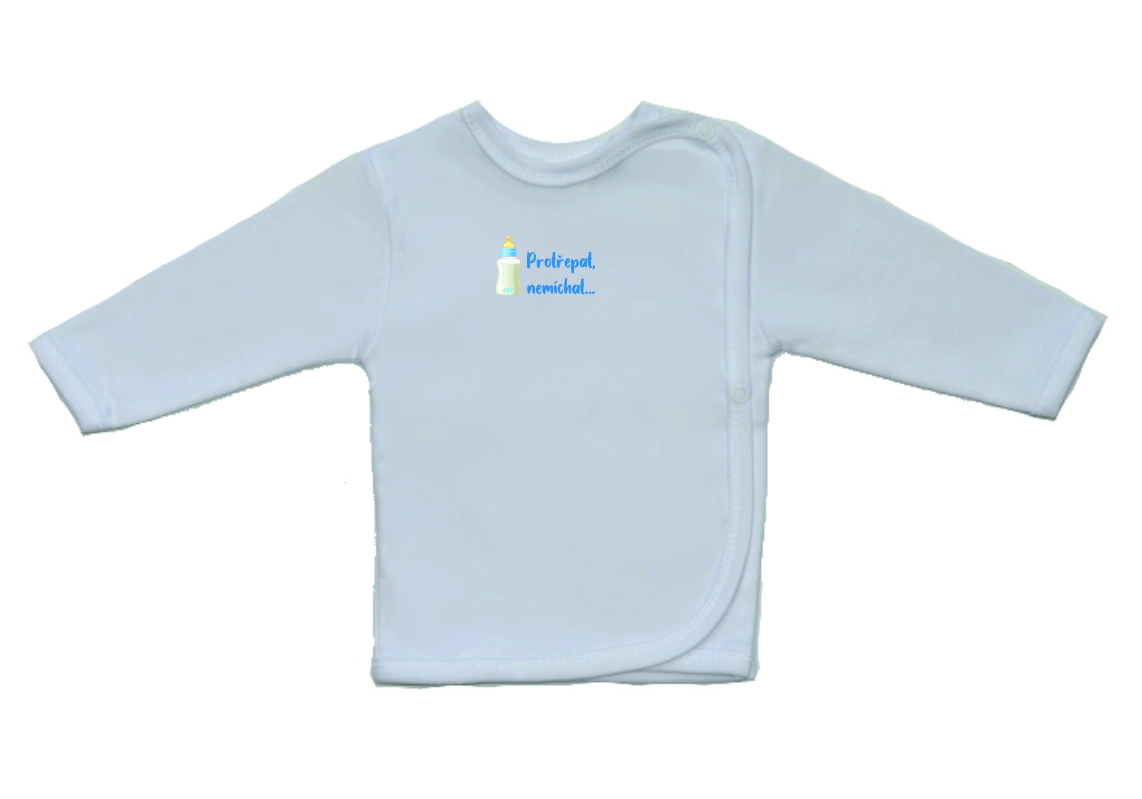 Kojenecká košilka Gama bílá s vtipným potiskem, protřepat nemíchat, v menším provedení, je krásná a velmi kvalitní košilka pro miminko, zdobená menším vtipným nápisem. Boční zapínání na cvočky po celé délce usnadňuje oblékání košilky miminku.