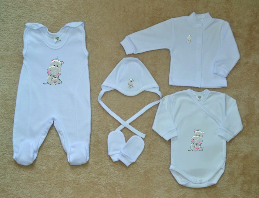 Bílá kojenecká soupravička pro miminko do porodnice Gama, DELUXE, roztomilý hrošík, je krásná, vysoce kvalitní, svým potiskem decentní, 5-dílná kojenecká soupravička pro miminko, která je vyrobená ze 100% velmi jemné, kojenecké, velmi příjemné, atestované bavlny, vhodné pro miminka.