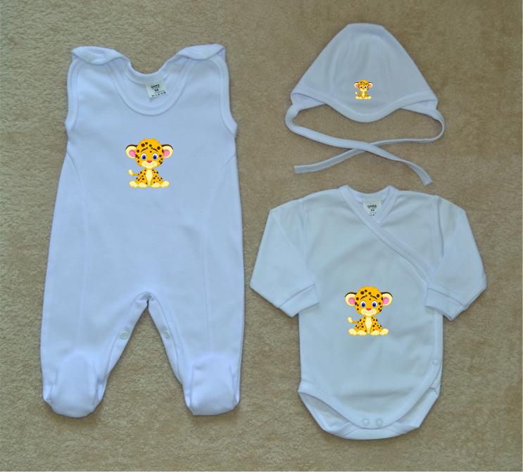 Bílá kojenecká soupravička pro miminko do porodnice Gama, Comfort bílá, gepard, je krásná, vysoce kvalitní, svým potiskem decentní, 3-dílná kojenecká soupravička pro miminko, která je vyrobená ze 100% velmi jemné, kojenecké, velmi příjemné, atestované bavlny, velmi vhodné pro miminka.