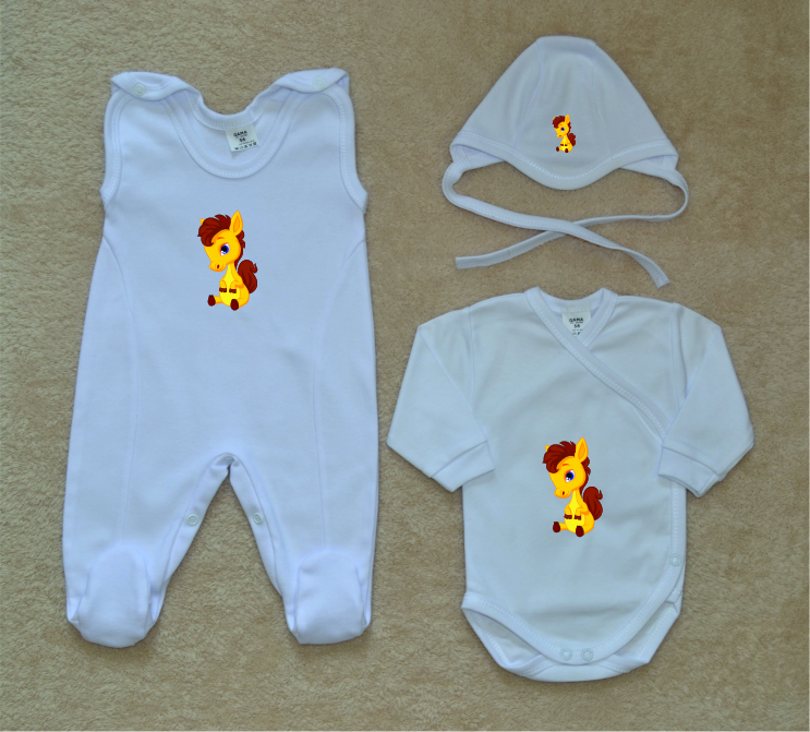 Bílá kojenecká soupravička pro miminko do porodnice Gama, Comfort bílá, koník, je krásná, vysoce kvalitní, svým potiskem decentní, 3-dílná kojenecká soupravička pro miminko, která je vyrobená ze 100% velmi jemné, kojenecké, velmi příjemné, atestované bavlny, velmi vhodné pro miminka.