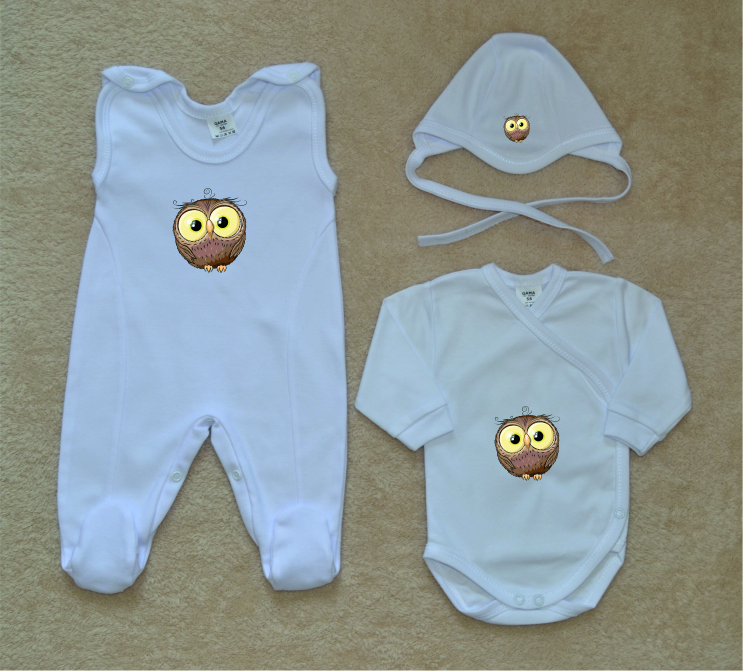 Bílá kojenecká soupravička pro miminko do porodnice Gama, Comfort bílá, roztomilá hnědá sova, je krásná, vysoce kvalitní, svým potiskem decentní, 3-dílná kojenecká soupravička pro miminko, která je vyrobená ze 100% velmi jemné, kojenecké, velmi příjemné, atestované bavlny, velmi vhodné pro miminka.