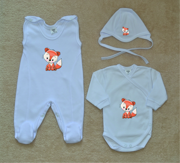 Bílá kojenecká soupravička pro miminko do porodnice Gama, Comfort bílá, roztomilá liška, je krásná, vysoce kvalitní, svým potiskem decentní, 3-dílná kojenecká soupravička pro miminko, která je vyrobená ze 100% velmi jemné, kojenecké, velmi příjemné, atestované bavlny, velmi vhodné pro miminka.