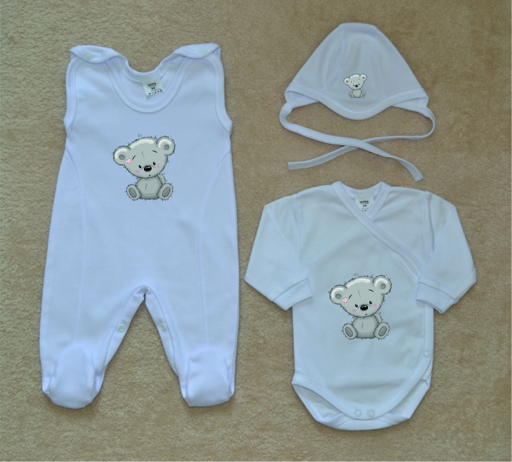 Bílá kojenecká soupravička pro miminko do porodnice Gama, Comfort bílá, roztomilý šedý medvídek, je krásná, vysoce kvalitní, svým potiskem decentní, 3-dílná kojenecká soupravička pro miminko, která je vyrobená ze 100% velmi jemné, kojenecké, velmi příjemné, atestované bavlny, velmi vhodné pro miminka.