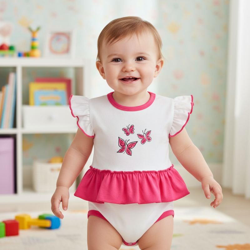 Dětské body se sukýnkou růžovo-bílé s motýlky pro holčičky je ideální volbou pro rodiče, kteří hledají kojenecké body s volánkem a stylové kojenecké body s volánky, které spojuje pohodlí, praktičnost a krásný vzhled. Toto dívčí body se sukýnkou s jemným motivem motýlků 🦋 zaujme na první pohled a zároveň poskytne maximální komfort při každodenním nošení.