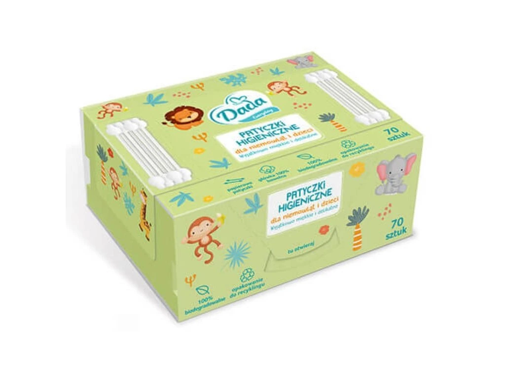 Dětské vatové tyčinky DADA jsou jemné hygienické pomůcky určené pro každodenní péči o miminka i malé děti. Díky měkké bavlně jsou šetrné k citlivé pokožce dítěte a vhodné pro jemnou hygienu od prvních dní života.