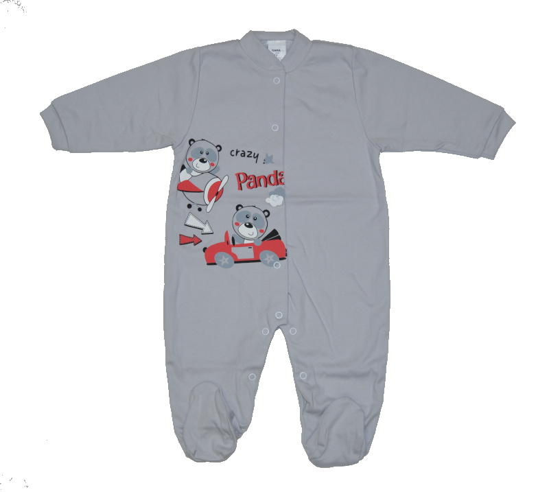 Dětský bavlněný overal na spaní, Gama, šedý crazy Panda, je krásný, kojenecký/dětský bavlněný overálek velmi vhodný pro miminko s tištěnými bezftalátovým, obrázkem. Kojenecký overal je vyroben ze 100% bavlny. Overal pro miminko má drukové (patentkové) baby zapínání po celé délce overálku pro velmi snadné oblékání a pohodlné přebalování.