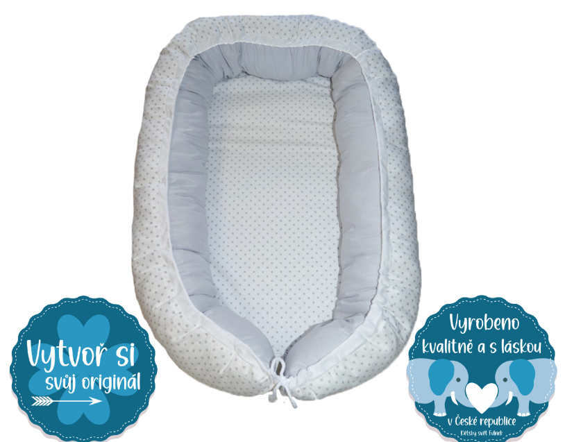 Dětské hnízdečko pro miminko, kokon, Dětský svět, šedý puntík, je speciální hnízdečko,(ohrádka) kokon pro uklidnění a spánek novorozenců. Vynikající pomocník pro první měsíce života miminka. Hnízdečka pro miminka si oblíbily maminky již v celé Evropě. Kokon je ideálním místem pro spánek novorozenců a nemluvňat - je menší a přítulnější než postýlka, miminka se v něm cítí bezpečně, jsou klidnější jako u maminky v bříšku. Cílem kokonu je omezit novorozenci prostor, aby mohlo dítě postupně přecházet z pozice embrionální do pozice ležící. Měkké okraje kokonu tulí nemluvně, tlumí ostré zvuky a zabezpečuje spokojený spánek a při péči o mimino zamezí nechtěnému přetáčení miminka.