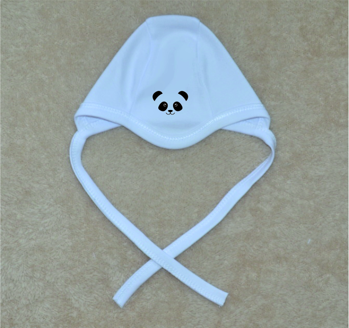 Kojenecká bavlněná čepička pro miminko Gama bílá s obrázkem, smile panda, je vyrobená z vysoce jemného, 100% bavlněného, atestovaného mako materiálu se zavazováním.