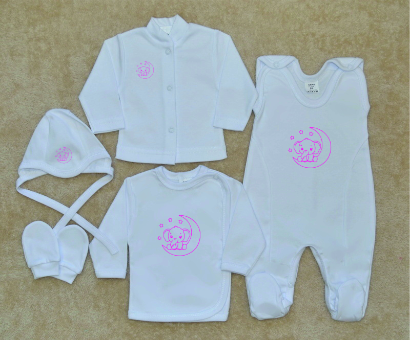 Bílá kojenecká soupravička pro miminko do porodnice Gama Exclusive slůně na měsíčku růžové, je nádherná, vysoce kvalitní, svým potiskem decentní, 5-dílná kojenecká soupravička pro miminko, která je vyrobená ze 100% velmi jemné, kojenecké, velmi příjemné, atestované bavlny, vhodné pro miminka.