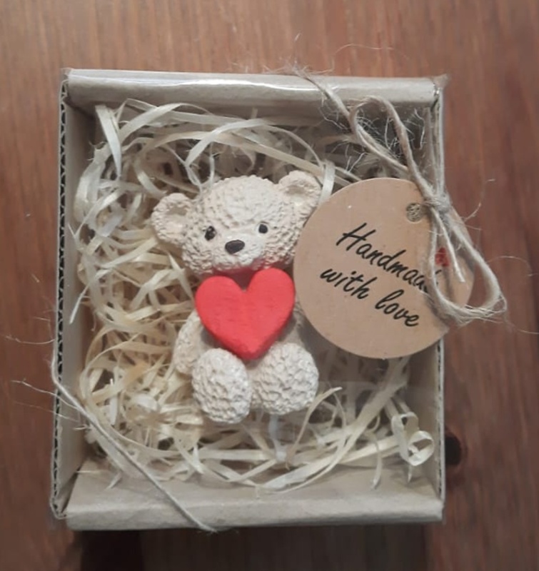 Medvídek s červeným srdíčkem je vyrobený z odlité sádry, ručně malovaný, o velikosti cca 5cm a je uložen v ručně vyráběné dárkové krabičce. Pěkný dekoračné prvek do dárkového balíčku k uvítání či návštěvě miminka.