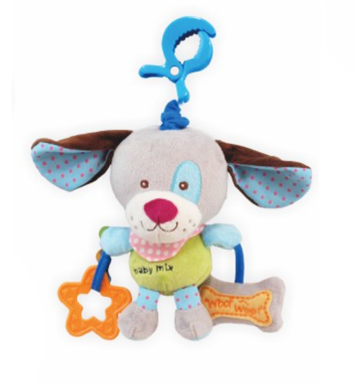 Dětská plyšová hračka na kočárek, Baby mix, melodický pejsek s kostičkou, je krásná dětská plyšová hračka sezávěsným klipsem. Díky vzdělávací hračce s veselým barevným provedením bude Vaše dítě objevovat svět barev, tvarů a zvuků. Hračka je vyrobená z kvalitního a příjemného plyšového materiálu. Plyšová hračka pro miminko, se dá díky klipsu připevnit na postýlku, kočárek či autosedačku.